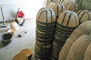 朴器03 坐着船去古荡折柳条,回来做成了栲栳。 文|马宁·图|王飞 据老一辈工匠回忆,东林柳编始于湖州东林镇上一户钱姓人家,距今有300多年的历史。《嘉庆·德清县志》中记载:“钱家潭出杨条,均挺柔韧,制笆斗销于远处”。《同治·湖州府志卷三十三物产》里也有记录:“栲栳……编柳条为之,缘以竹片。小者曰笆斗,亦曰三笆,又有四升斗,搀箕蒲篓”。 笆斗,一种用柳条编织而成的盛器,根据容量和用途又分为“栲栳、拎笆、四升斗、鞋扁”等。其中,“拷捞”是最常见的一种,又叫“栲栳”。唐代的卢延让在描写富家子弟挥金如土时,曾写下“五陵年少粗于事,栲栳量金买断春”的诗句。 清水湾码头 上世纪八十年代是东林柳编最兴盛的时候。改革的春风吹过大城小镇,私有经济跃跃欲试。就像温州的鞋城、宁海的皮草一样,柳编就是东林的代名词。方圆千里内,柳编是东林镇一张尽人皆知的名片。 那时汽车还未普及,密集成网的江河是大自然对东林人最好的馈赠。这点直接体现在了东林镇各个村庄的名字上:泉心村、泉益村、泉庆村。这三个以“泉”命名的村庄也是东林柳编的中坚力量。 三个村庄组成了一个三角形,正中央就是清水湾码头。大概是河水清澈的缘故,当地人将这些纵横交错的河流统一称为清水湾。这个码头,这条江湾,构成了东林柳编销往杭嘉湖的一点一线。 湿润的江南空气和清澈见鱼的碧水,让这里成了滋养柳树的一番佳地。300多年来,家家户户门前柳树成荫,半掩村桥半拂溪。在柳编行业最火的年代,这些成片的柳树无法满足生产需求。于是,村口的门市部应运而生,它专门收购来自全国各地的柳条。 泉心村有一位退休老人,70多岁,头发花白,脸上的褶皱里刻满了光阴的痕迹。他佝偻着背向我描绘当时的场景:“古荡那里全是柳树,可杭州人不做柳编,我们就坐一天的船到古荡折柳条。当时古荡还是农村,也没人管我们,半天时间就能满载而归。” 那些乘着小船来的柳条,数月之后,就将以栲栳的形式回到杭州。但身价已经涨了,8元一只。除了东林本地外,栲栳很少以零售的形式出售给个人,因为太畅销了啊,工厂大单都顾不过来。在上世纪九十年代初,单杭州东华链条厂每月就需要买3000只栲栳。如果算上整个杭嘉湖地区,月销上万只是最起码的估算。 如今的清水湾码头早已废弃不用。青石板上杂草丛生,门前的垂柳依然在,可收购柳条的人去了哪里? 洪武赶散 东林人的柳编制品大多供应杭嘉湖地区。可有一个地方他们是绝对不去的,就是苏北。原因倒也简单,位于苏北的正红镇也是有名的编织之乡。东林人每说到这里,总不忘炫耀一阵:“那里的柳编全是从我们这学去的。” 这句话并非吹牛,说的是元末明初的一件事。 江苏大丰市人张士诚是元末农民起义的领袖之一。当年,他领导的起义军纵横江浙一带,控制了几乎整个江南地区。只是后来张士诚不思进取,最后被朱元璋给俘虏了。可杭嘉湖一带的绅民们依然对张士诚感激不尽,拥戴有加。朱元璋为了报复,就以垦荒为由,将40多万人丁驱赶到苏北,另有一小部分驱赶到了江西一带。 后人将这件事称为“洪武赶散”。 从史学角度考量这一事件,朱元璋的所作所为当然很粗暴。可具体到柳编上,却因祸得福般地进行了传播。江西一带至今仍存有柳编技艺,也与这一事件有关系。 时至今日,当正红镇上的柳编早已实现机械化的规模生产时,东林柳编只能靠几位老工匠在艰难地坚持着。但他们相信,在这个讲求快速的塑料时代,仍然有人会偏爱这种自然织物,以及柳枝那种无可替代的摩挲手感。 我是业务员出身。当邻里乡间都在做柳编时,我负责把做好的柳器运往杭州售卖。这份工作从初中毕业一直做到了而立之年。 1996年,那一年我30岁。村里从事柳编的人越来越少,更多的青年选择外出打工。收入稳定,来钱也快。但我不愿意。跑了十多年业务,我也算见过世面了,知道哪些地方还需要柳编。当然,一个更重要的原因是舍不得看这份老手艺就这么慢慢地消亡。 后来我和妻子合办了一个柳编小作坊,很快从夫妻档变成了九人的小团队。每天夜以继日地工作,一天能售卖数百只栲栳。但时代终归不可逆,塑料制品大行其道的年代,柳编的生存空间愈加逼仄。现在,这个孤独的柳编作坊里,又只剩下我和妻子两个人了。 邵建林 57岁/ 湖州市东林柳编技艺传承人 |
