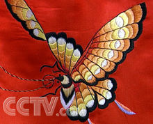 原来京绣专门为宫廷服务,有些图案已经不适应如今人们的审美需求,比如龙袍和大臣的补服,除了用做收藏,没有谁再会去穿。但经过老艺人们的改造,在一些现代衣服上,京绣这门古老的技艺得以再生,如一件红色唐装,可在敞衣上用金线绣上"寿"字等纹样。"寿"字在中心,两侧还可绣上万富寿喜,它代表了一种中国的高贵文化并希冀所有福寿的东西都集于一身。"